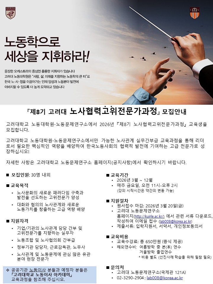 고려대학교 노동대학원·노동문제연구소에서 2026년 『제8기 노사협력고위전문가과정』 교육생을 모집합니다.